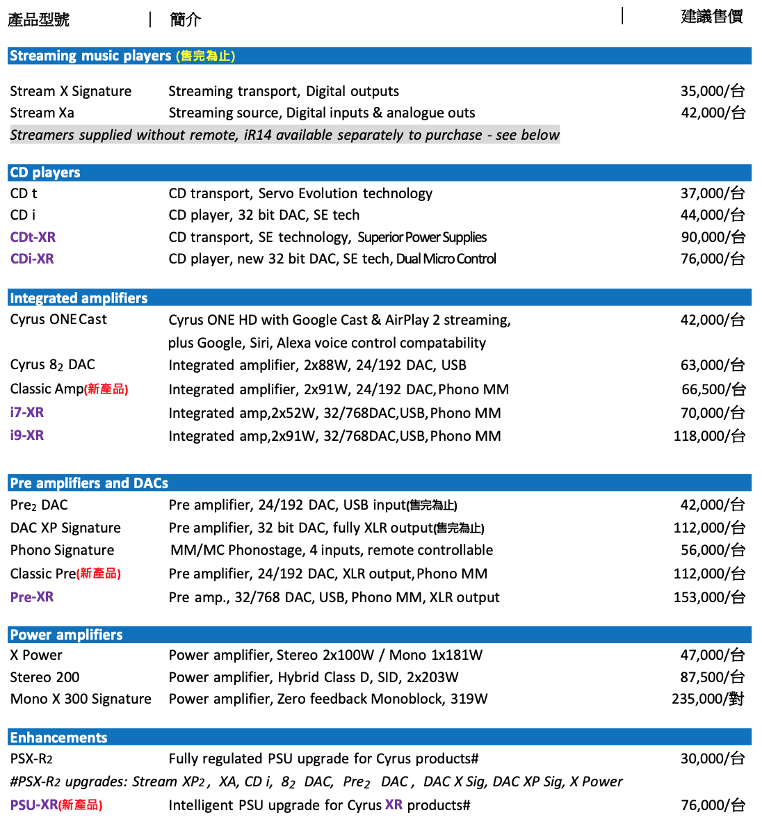 - 舊型之CYRUS綜合/前級/後級擴大機,可更換新型的 CYRUS唱頭/綜合/前級/後級擴大機,惟 Mono X 300 Sig.需以2台舊型之CYRUS綜合/前級/後級擴大機做為更換。