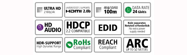 具有專業光纖技術的HDMI訊號線。 這項技術可在長達100 m的傳輸路徑上實現高達24 Gbps的數據傳速率。 因此,它支持50Hz或60Hz的4K高解析格式,並且是通過長距離連接具有HDMI 2.0B連接端設備的解決方案。