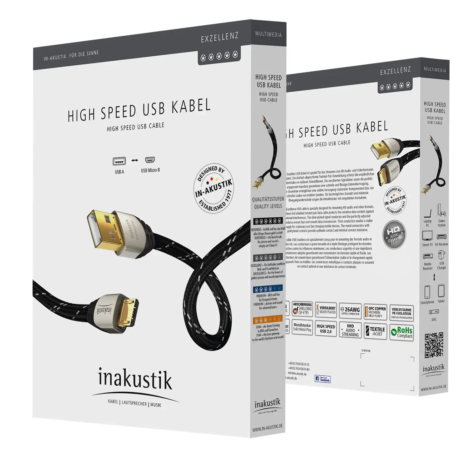 High Speed USB A ⇄ Micro-B(Exzellenz) 是 inakustik 專為 音響串流與高品質資料傳輸 所設計的高階 USB 線材,適用於 DAC、串流播放器、外接硬碟與音訊設備 等應用。