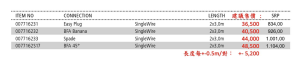 • BFA香蕉插、BFA 45°香蕉插、SPADE Y型插、或Easy Plug簡易接頭四種接頭之選擇