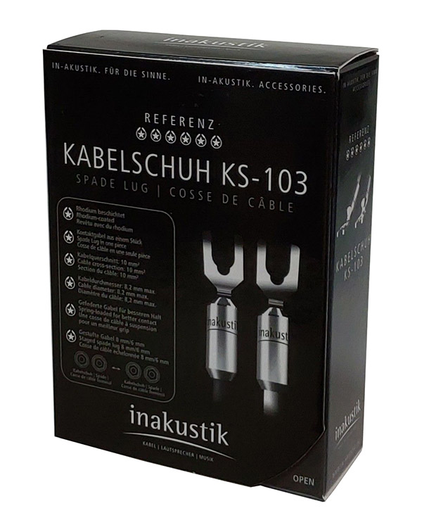 整只REFERENZ KS-103是一體成形的,因此可以避免因接觸不確實導致在接觸面有阻抗產生。KS-103之鍍銠層使得接頭表面相當堅固。 一個特殊的特點是開槽的鏟形接片,Y型插前端兩邊分岔的接觸面與其它裝置緊密連接時,會呈現彎曲的狀態,如此便能讓接片不致脫落。 適用於 in-akustik REFERENZ 喇叭線或他牌截面積大於 10 mm² 的所有HI-END喇叭線。