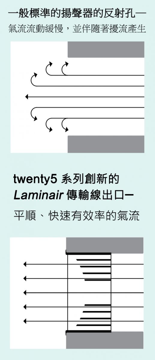隨著twenty5系列發表,聲音表現因著創新的Laminair空氣動力學原理的傳輸線出口設計,亦往前進展了一大步。