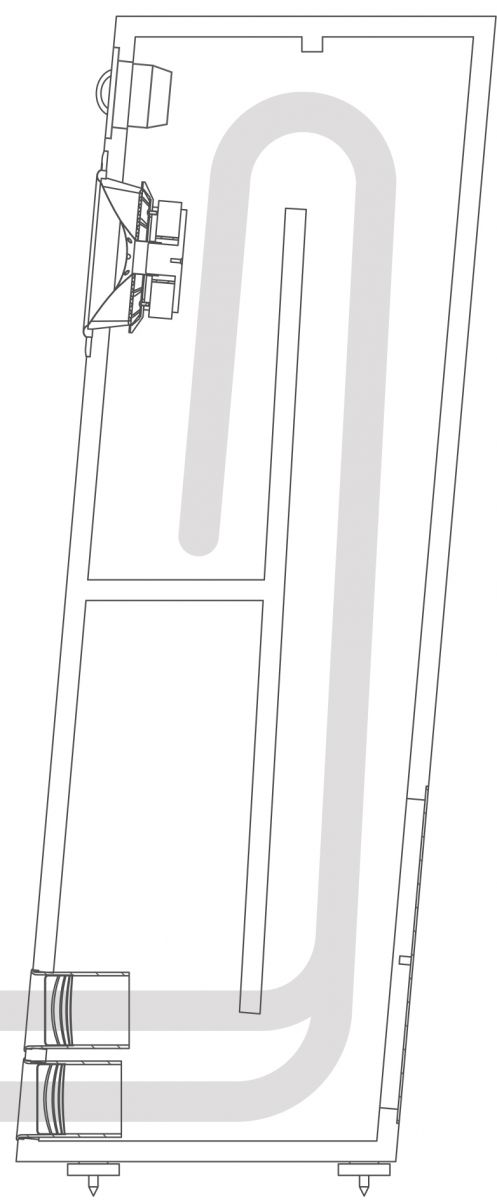 ATL是一項精巧的設計。在體積有限的音箱內部進行切割,創造出上下相連的管道;在管道的最末端,還必須安排一個特定尺寸的孔位,作為整個聆聽空間與揚聲器低音單體推擠氣流相對應的通氣口。這種設計的最大好處,是從頭到尾都以迷宮式音箱塑造低音,幾乎可以徹底解決音箱造型與空間牆面所帶來的聲音染色問題─而音箱設計的完成度,與內部管道隔層板的規劃,則是傳輸線式音箱的成功關鍵,目的旨在創造傑出的低頻表現,而不需要將音箱尺寸無限制的擴大。